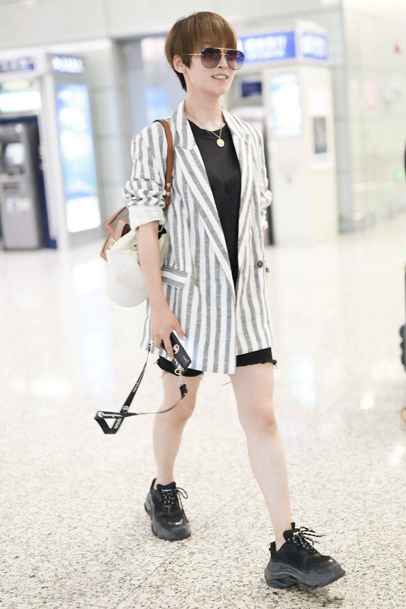 条纹西装的搭配也很值得借鉴,毕竟这种条纹看起来会更加休闲,黑白色的条纹也很简洁,加入了短裤和运动鞋搭配,可以凸显一种休闲的气质,穿起来并不觉得俗气。谢楠的整个搭配都非常休闲简约,没有花里胡哨的设计,轻轻松松就提升了她的个人魅力。